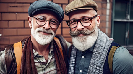 Senior LGBT couple posing in downtown. 60 yo people have travel. Ai generative