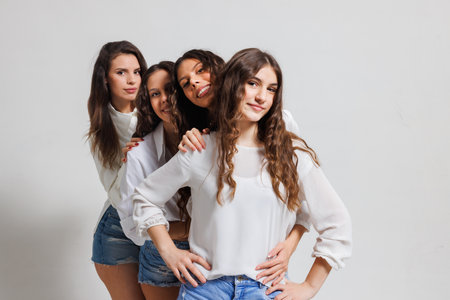 group of multiethnic women with different kind of skin posing together in studio. Concept about body positivity and self acceptance