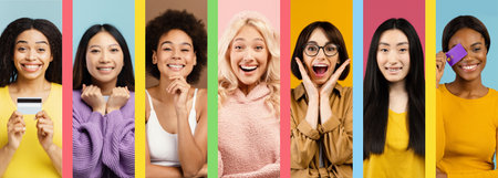 Collage of Diverse Women Smiling, Showcasing Joy and Excitement in a Colorful Setting