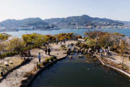 Glover Garden in Nagasaki, Japan, Minamiyamate hill, beautiful park view, with city skyline and cherry sakura blossom, in a spring sunny day with a blue sky, Nagasaki prefecture, Kyushu island region