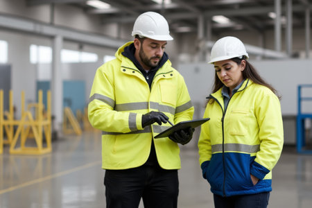 Two construction engineers actively discuss project details while using tablets on an excavation site. Wearing hard hats and safety vests, they focus on their task amidst machinery and earth.