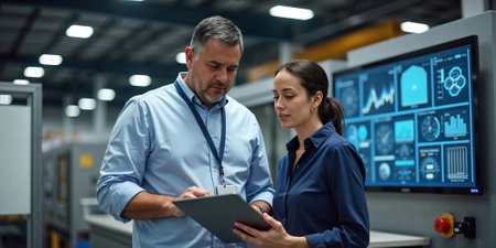 Portrait of factory supervisor using tablet and talking to young woman in warehouse while doing inspection and production quality control