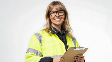 A woman wearing a yellow safety vest and glasses is holding a clipboard. She is smiling and she is happy