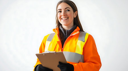 A woman wearing an orange safety vest and holding a clipboard. She is smiling and she is happy
