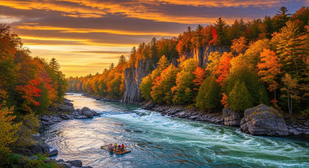 A picturesque autumn scene featuring a forest of vibrant trees reflected perfectly in a calm lake, creating a symmetrical and tranquil view.