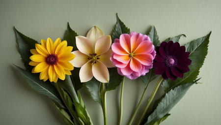 AI Generated. Four Colorful Flowers Arranged in a Row on a Green Background