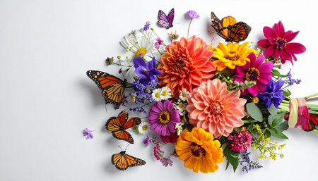 Bouquet of colorful flowers and butterflies on white background, top view