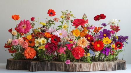 A stunning display featuring a diverse array of colorful flowers arranged on a rustic wooden base, perfect for home decor or event decoration.