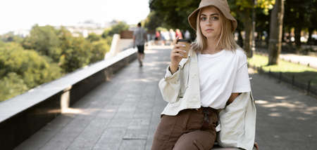 tourist woman in a European city, tourism in Europe. young woman in the park with coffee in her hands. Disposable paper cup.
