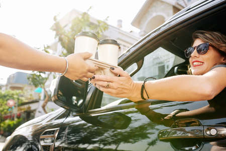 Coffeeshop worker giving cardboard tray with two cup of take-out coffee to female car driver