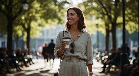 A woman walking in a park, holding a coffee cup, wearing a light-colored outfit, smiling, surrounded by trees and people sitting on benches