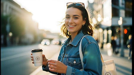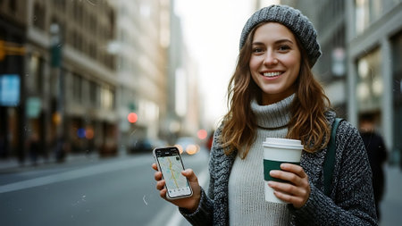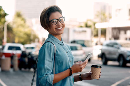 Portrait of a smiling young woman with coffee cup and mobile phone in the city