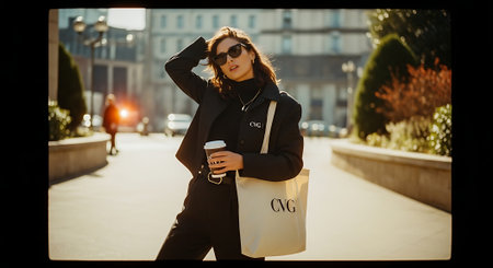 A stylish woman in black clothing posing with a coffee cup outdoors