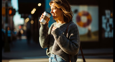 beautiful woman in sweater holding paper cup of coffee on city street