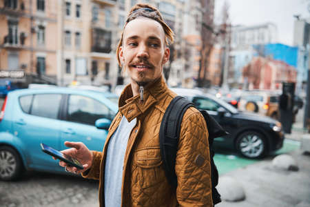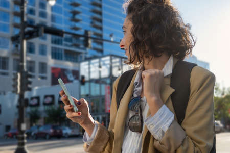 Portrait of woman with jacket, backpack and cell phone in hand in city, concept new beginnings, with copy space.