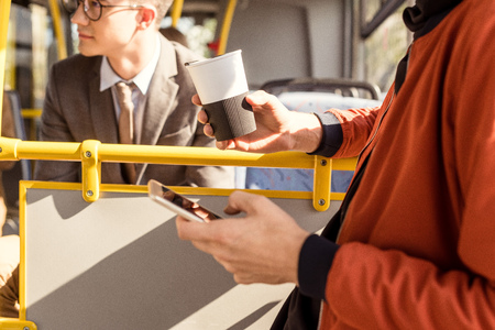 selective focus of man with coffee to go in hand using smartphone while riding in public transport