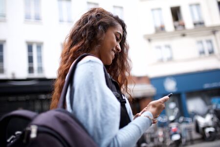 Side portrait of smiling young woman walking in the city with bag and looking at mobile phone
