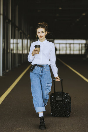 A person is walking confidently holding a coffee cup in one hand and pulling a suitcase with the other bright indoor area during daylight hours.