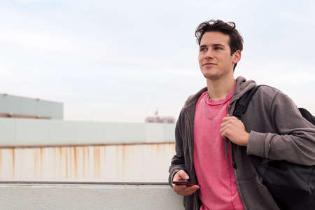 attractive happy young student holding mobile phone, communication concept and urban lifestyle, copy space for text