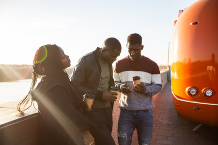 Group of happy young people using mobile phone and drinking coffee in the city