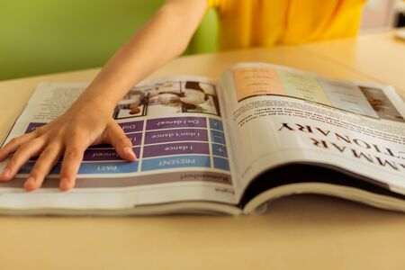 A person reading and showing on one word, glossary of Bosnian words translated in English.