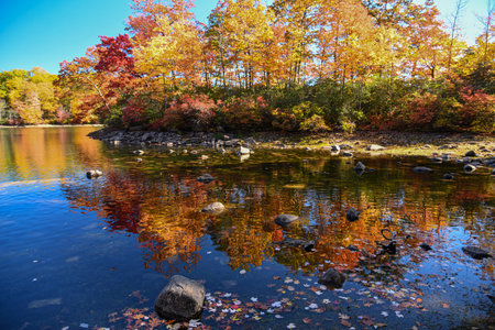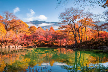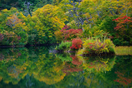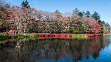Kumobaike Pond autumn foliage scenery view, multicolor reflecting on surface in sunny day. Colorful trees with red, orange, yellow, golden colors around the park Karui inzawa, Nagano Prefecture, Japan
