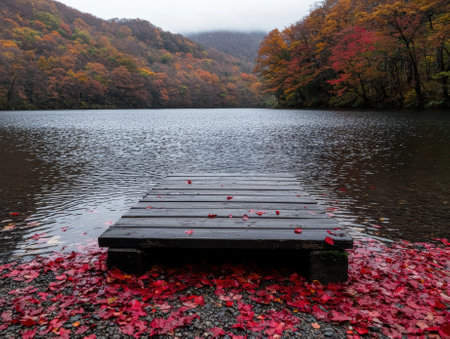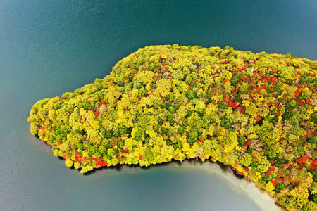 Beautiful lake view in autumn in Karuizawa, Japan, with many maple trees turning bright red.