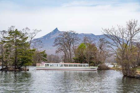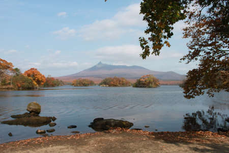 Scenery view from Lake Onuma with Mt. Hokkaido Koma-ga-take in background. Onuma Quasi-National Park. Town Nanae, Oshima Subprefecture, Hokkaido, Japan