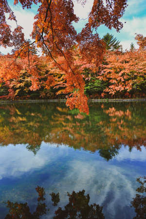Autumn leaves reflected in the lake, Autumn season in Japan.