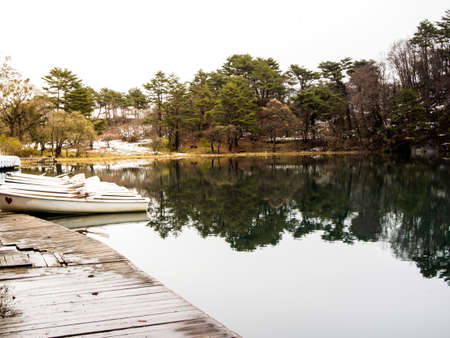 the boats parked at the pier in the lake ,Fukushima , Japan