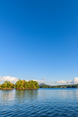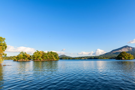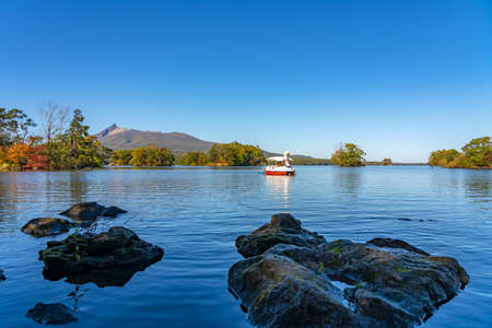 A scenic view of Lake Hibara with Mount Bandai in the background on a crisp, clear day in October. Located in the Bandai-Asahi National Park, Fukushima, Japan.