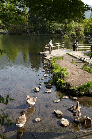Cute duck pedal boats floating in the pond of Kichijoji Inokashira Park