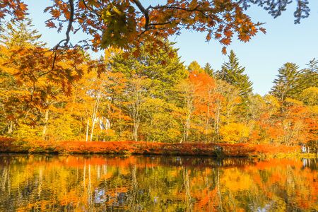 Beautiful Japan autumn at Kumoba Pond or Kumoba ike of Karuizawa ,Nagano Prefecture Japan.