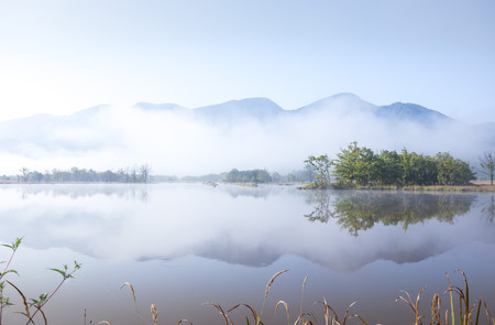 Morning fog on Kido Lake, kougen Shiga, Japan. The morning mist of lake of autumnal leaves of Shiga Highlands is very fantastic.