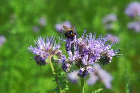 Bumblebee sits on a flower and eats nectar. Summer bright macro shot. Copyspace.