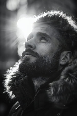 Portrait of a bearded man on the background of the sun.
