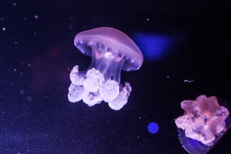 Close-up Jellyfish, Medusa in fish tank with neon light. Jellyfish is free-swimming marine coelenterate with a jellylike bell- or saucer-shaped body that is typically transparent.