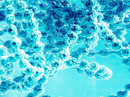 Blue beads in water with bubbles, Christmas card, abstraction.