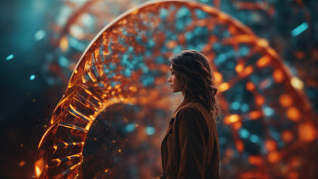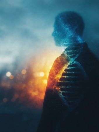 A figure stands against a backdrop of glowing urban lights, with a vibrant DNA strand superimposed, symbolizing life and transformation during dusk.