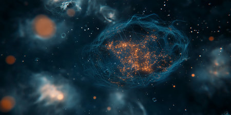 Glowing nodes connect within a nebula, creating a vibrant cosmic web.