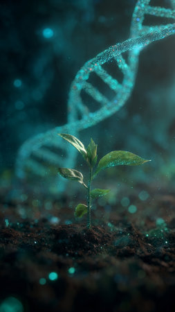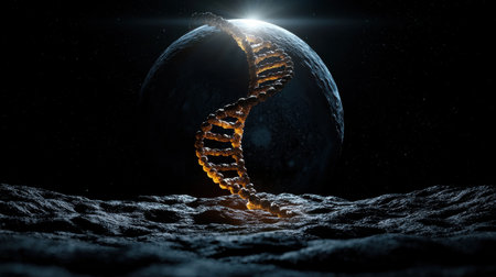 A DNA strand is shown in a dark, rocky area. Concept of mystery and wonder, as the DNA strand is a symbol of life and the building blocks of all living things