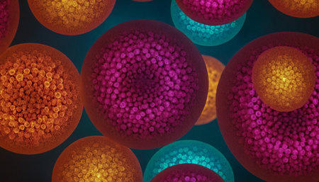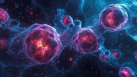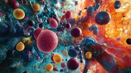 This striking abstract image depicts a vibrant cosmic environment filled with colorful spheres, representing life at a microscopic level, ideal for scientific themes.