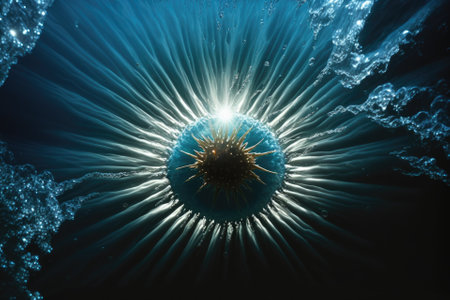 a sunburst with air bubbles in a deep blue sea, an abstract underwater picture. Generative AI