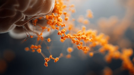 Close-up view of a digital rendering of a neural network, featuring interconnected orange spheres and delicate, branching filaments.