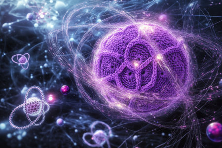 Complex visual of atomic structures intertwined with cosmic elements in vibrant colors and patterns.