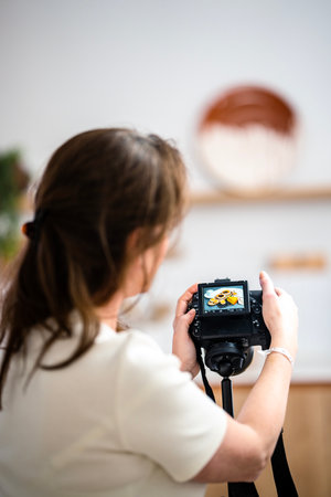 Female food blogger making content with her smart phone while having breakfast