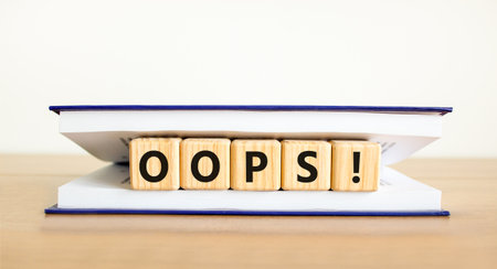 Oops symbol. Concept word Oops on beautiful wooden blocks in book. Beautiful wooden table white background. Business lifestyle oops concept. Copy space.