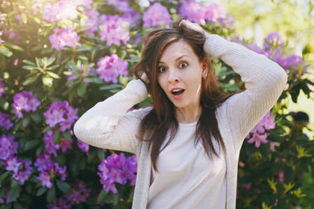 Portrait of beautiful sensual brunette hair young woman with charming smile wearing light casual clothes. Smiling female near flowering bush in city park outdoors on spring nature. Lifestyle concept