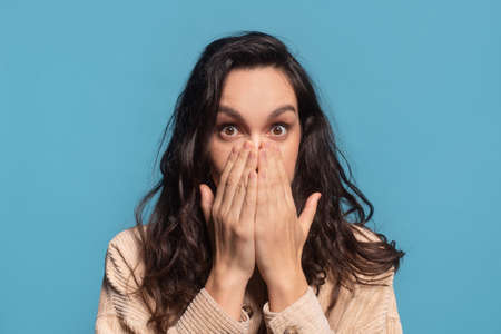 Young excited lady in beige sweater looking forward as she is surprised by event or news, holding hands against mouth and looking at camera with shocked face expression, isolated on blue background