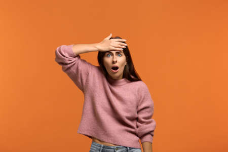 Crap, I forgot to do this. Portrait of worried stunned woman in pink sweater slapping forehead with palm and dropping jaw, recalling an important thing and being troubled, isolated on orange background